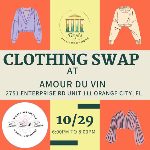 Join Fayes Pillars of Hope and Babes Booze & Business for a fun-filled evening of swapping clothes and networking with amazing women. Bring your gently used clothes to swap, and any items that don’t find a new home will be donated to a local shelter.